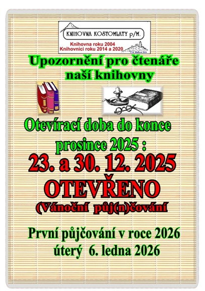Letošní kalendář Vás provede stoletou historií české knihovny v Kostomlatech a také třemi známými působišti v obci. Historie se odvíjí od zápisu v kronice NJS z května roku 1924, kde je zvolena knihovní rada a jmenován knihovník. Současná knihovnice vede knihovnu od roku 1962. Od roku 2019 je knihovna umístěna v důstojných prostorách uprostřed obce. Však se přijďte podívat a třeba si i něco přečíst.